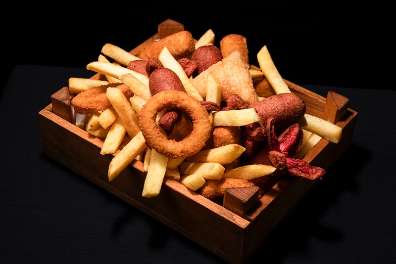 6 sosis, 3 soğan halkası, 3 piliç nugget, 3 patates kroket, 2 puf böreği, 450 gr. patates kızartması; yanında ev yapımı ranch sos, ev yapımı ballı hardallı sos, barbekü sos ve acı sos ile servis edilir.