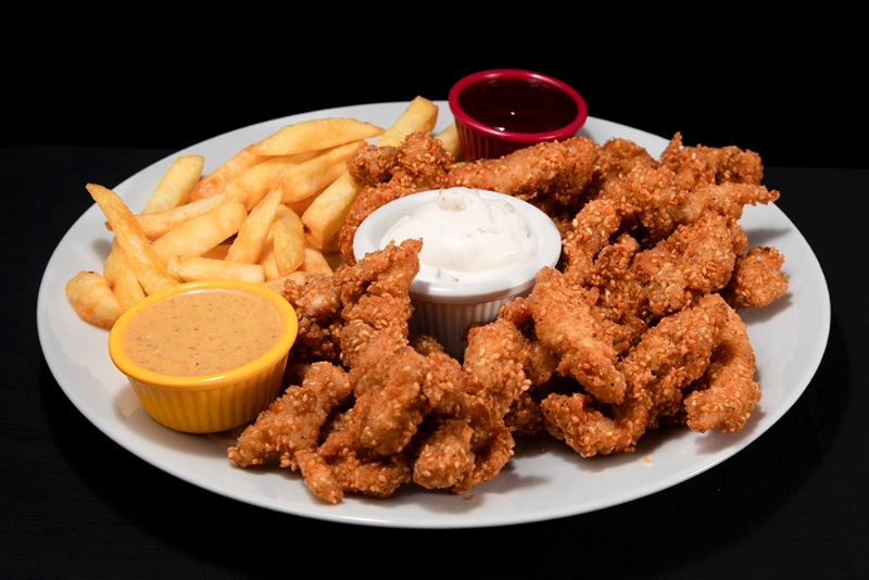 160 gr. susamlı çıtır tavuk patates kızartması; yanında ev yapımı ranch sos, ev yapımı ballı hardallı sos ve acı sos ile servis edilir.