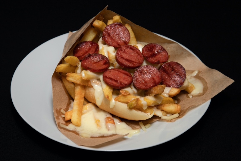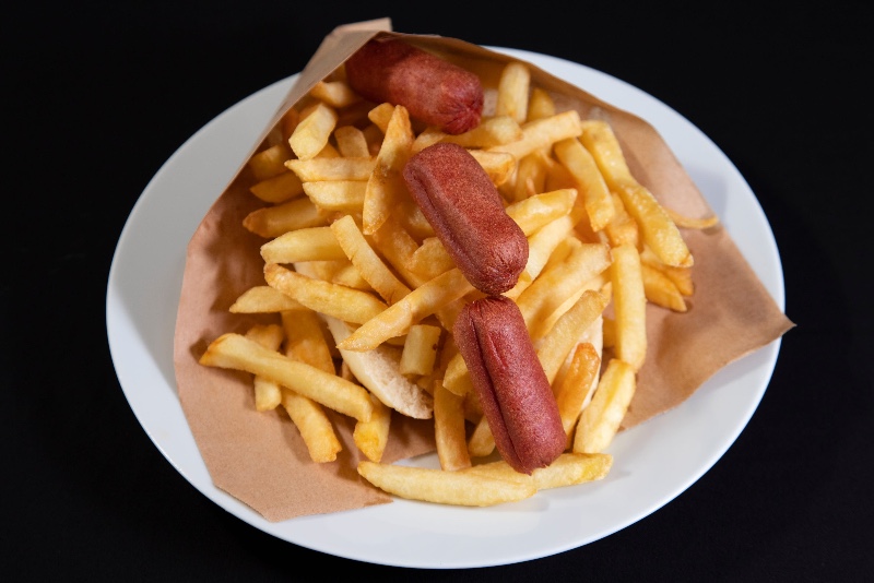 10 adet sosis 450 gr. patates kızartması; yanında ev yapımı ranch sos ve barbekü sos ile servis edilir.