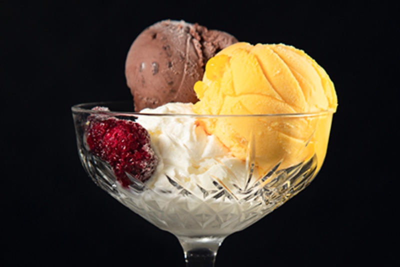 Vanilyalı veya çikolatalı veya karamelli dondurma ile