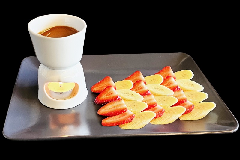 Bitter veya sütlü veya beyaz çikolata, yanında muz ve çilek ile