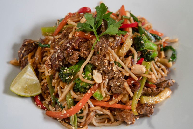 140 gr. biftek, renkli kapya biberler, mantar, brokoli, fasulye, havuç, kişniş, kırmızı soğan, taze soğan, susam, taze zencefil, istiridye sos, soya sos ve susam yağı; yanında chilli biber sos ile