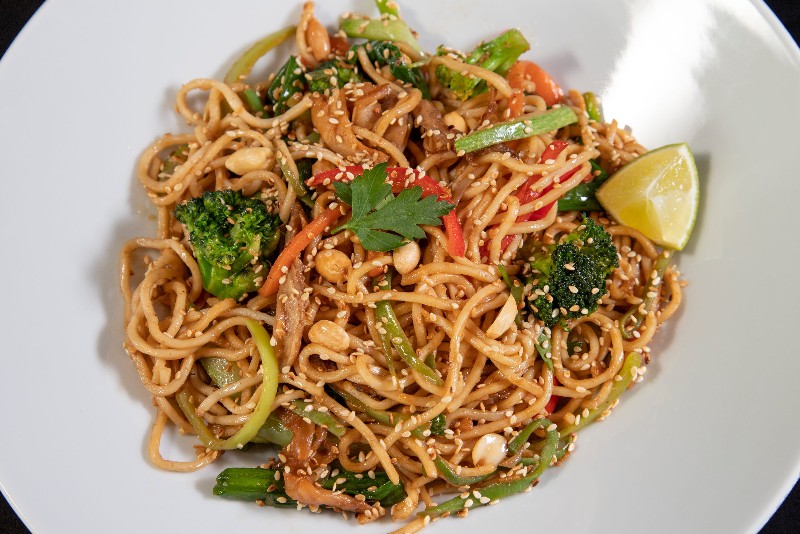 140 gr. tavuk, renkli kapya biberler, mantar, brokoli, fasulye, havuç, kişniş, kırmızı soğan, taze soğan, susam, taze zencefil, istiridye sos, soya sos ve susam yağı; yanında chilli biber sos ile